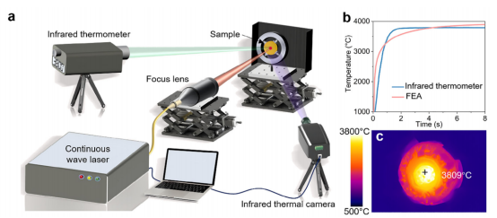 该研究通过高熵成分工程策略成功开发了具有高达3600℃(2.7μm·s−1)优异抗氧化性能的钨基高熵陶瓷(HEC-W),在超高温应用中取得重大突破。研究使用巨哥科技的红外热像仪对所制备的HEC样品进行超高温氧化试验,记录温度: an infrared thermal camera (MAG HT60ET, Magnity Technologies, Shanghai, China) was utilized to conduct ultrahigh-temperature oxidation tests on the as-fabricated HEC samples.
