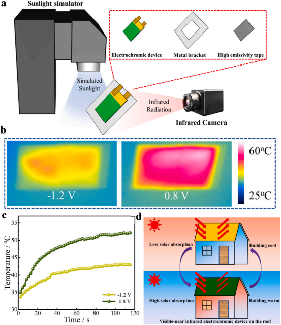 该研究以金箔为导电材料,制备了一种具有高反射率的柔性导电金电极,通过循环伏安法在柔性导电金电极表面沉积聚苯胺(PANI)薄膜,随后制备出基于PANI的电致变色器件,在太阳辐射调节方面具有广阔的应用前景。研究使用巨哥科技的红外热像仪测量电致变色器件在不同电压下的吸热效果:The thermal infrared radiation images of the PANI film and the electrochromic device were measured by an infrared thermal imager (Magnity MAG 32), with an infrared thermal imaging wavelength range of 7.5~14μm.