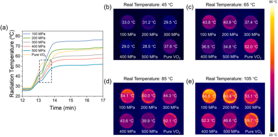 该研究发现适当降低烧结温度有利于生成纯VO2/Al复合材料,在此基础上增加压力使材料致密,同时烧结过程中的高压对复合材料的潜热有负面影响。研究使用巨哥科技的红外热像仪拍摄在不同压力下烧结的纯VO2和VO2/Al复合材料的辐射温度-时间曲线,以及在不同温度下的相应红外热像图:In order to evaluate the infrared stealth properties of the samples, thermal images were taken using an infrared thermal camera working in the 8-14μm region (Magnity Technologies, Shanghai, China).