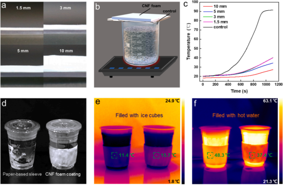 该研究通过表面活性剂辅助的纤维素纳米纤维(CNF)机械发泡后的烘箱干燥来制备纤维素泡沫,具有超低密度、超高孔隙率和低导热性,使其成为一种出色的隔热材料。研究使用巨哥科技的红外热像仪记录不同厚度的CNF泡沫片覆盖在热源(放置在连续沸腾的水上的玻璃板)的表面上,记录其表面温度随时间的变化:the temperatures of their surface were recorded with an infrared thermal imaging camera (MAG91, Shanghai Magnity Tech nologies Co., Ltd., China).