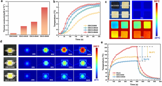 该研究开发了一种具有动态亚胺键合交联网络的柔性材料,该材料由生物基香草醛(VAN)、甘油三缩水甘油醚(GTE)和双氨基封端的聚二甲基硅氧烷(AT PDMS)合成。该复合材料不仅保持了出色的自愈性能和延展性,还表现出优异的持久粘合能力,这使得导热复合材料能够更好地适应实际应用中的各种复杂工作条件,从而提高了散热效率。研究使用巨哥科技的红外热像仪观测不同复合材料放在加热板上的温度随时间变化:An infrared thermal imager (MAG32, Magnity Electronics) recorded the temperature distribution of the samples and visualized the thermal management system of the samples.