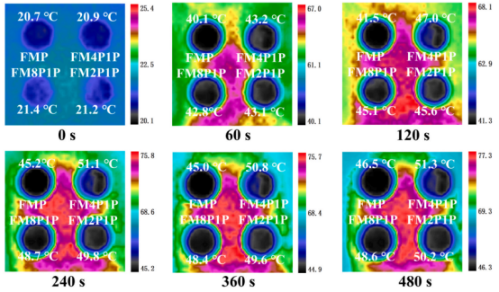 该研究成功制备了一种新型柔性相变复合膜(FPCM),结合了高潜热储能和温度调节性能,在电子设备的储能和热管理方面显示出巨大的前景。研究使用巨哥科技的红外热像仪观测FMP, FM8P1P, FM4P1P and FM2P1P四种材料的升温情况:with sample temperature changes monitored over time using an infrared thermal imager (MAGNITY MAG12, China).