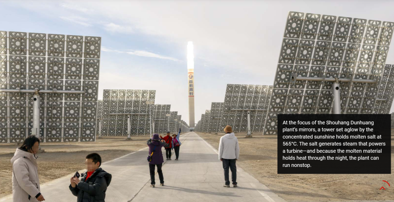 在该文中,两张配图震撼展示了敦煌首航100MW熔盐塔式光热电站,上万个定日镜随太阳位置转动,将阳光反射至集热塔顶的吸热器,熔盐被加热至565℃,产生蒸汽驱动涡轮机发电。