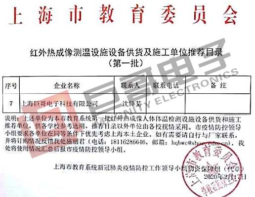 为确保上海市中小学和幼儿园顺利开学,确保广大师生健康安全,上海市教育系统疫情防控领导小组办公室近日发布关于做好入校人员体温检测设备配置工作的通知,巨哥电子入选上海市教委第一批红外热成像测温设备供货单位推荐目录。